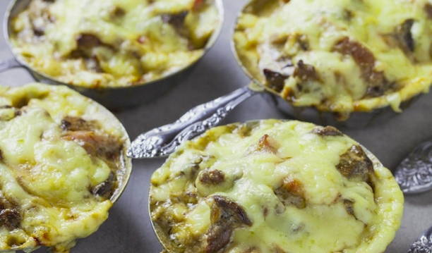 Heerlijke julienne met kip en champignons met zure room in potten