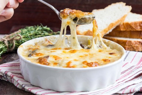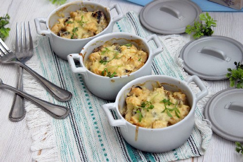 Julienne met kip en champignons met kaas in de oven
