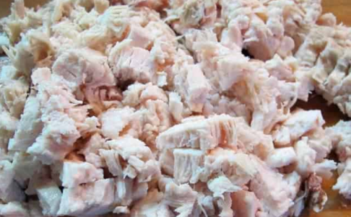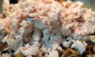 - Kook de kipfilet 20-30 minuten van tevoren, laat afkoelen en verdeel met een vork in stukken. Je kunt het vlees in kleine stukjes snijden en in een koekenpan bakken tot het zacht is, dat wil zeggen, zodat het alleen van kleur verandert van roze naar grijs.
