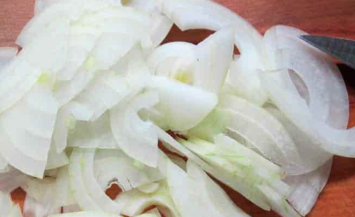 - Pel de ui en snijd hem in dunne halve ringen.