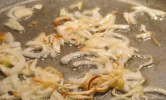 Schil de uien van het kaf, snijd ze in dunne halve ringen en leg ze in een koekenpan met verwarmde olie. Neem plantaardige olie, maar het is lekkerder om in boter te bakken.