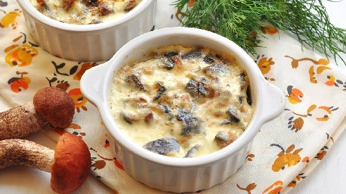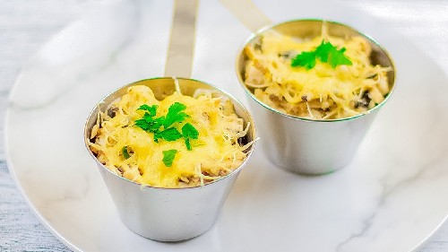 Julienne met kip en champignons met room in de oven - een klassiek recept