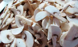 Terwijl ze roosteren, spoelt u de verse champignons (champignons), snijdt u ze in plakjes en doet u ze in de pan.