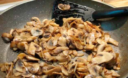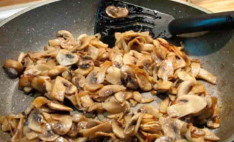 - Verhit 3 eetlepels boter in een koekenpan en bak de champignons met vlees erin gaar. Bestrooi ze naar eigen smaak met peper en zout.