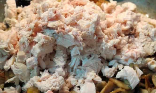 - Breng het gesneden kippenvlees over in de pan naar de gebakken champignons.