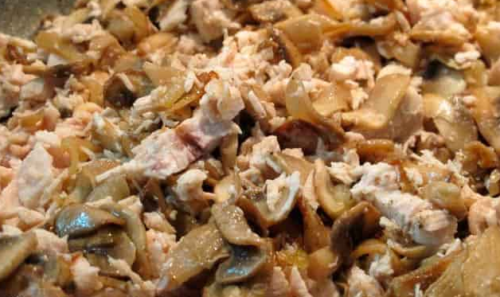 - Leg de gesneden kip in de gebakken champignons, voeg mayonaise toe, bestrooi alles met de juiste hoeveelheid bloem en meng goed. Voeg zout en peper toe, houd er rekening mee dat de kip gekookt is met kruiden.