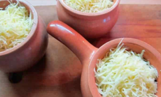 - Bestrooi julienne met geraspte kaas op een grove rasp en stuur het naar de oven voorverwarmd tot 180 °. We bakken de julienne tot de kaas goudbruin kleurt.