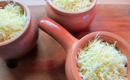 - Maal de harde kaas op een grove rasp en bedek de inhoud van de potten ermee.